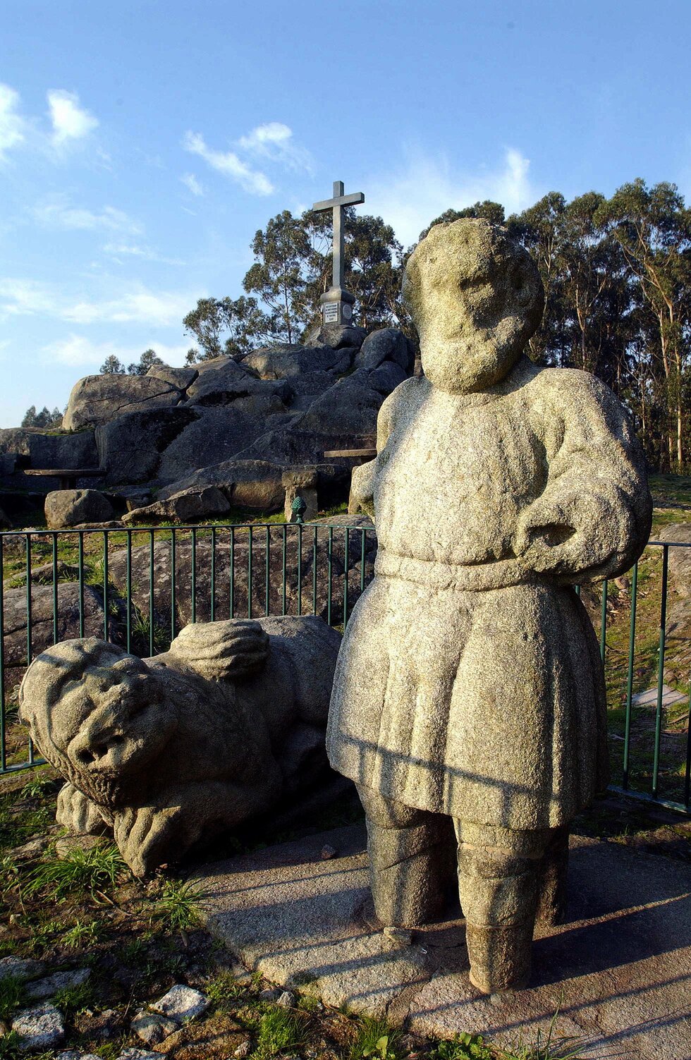 Trata-se provavelmente da representação de algum antigo guerreiro ou herói mítico. Está acompanhada por uma outra escultura zoomórfica que parece representar um leão de traços fantásticos. A estátua, de traços um pouco frustes, apresenta uma figura com barba, couraça, cinturão e joelheiras.