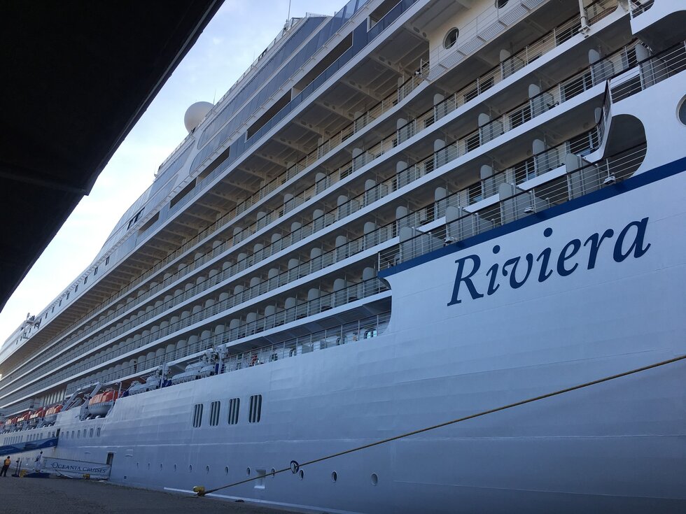 O navio Riviera, o mais recente navio de cruzeiros da companhia Oceania atracou hoje, dia 22 de agosto, na Gare de Passageiros de Leça da Palmeira.