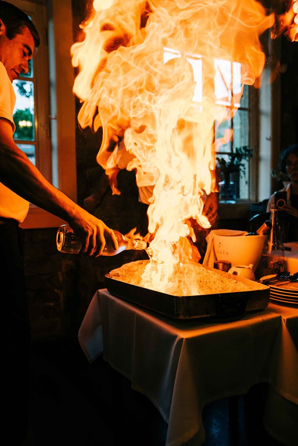 Para os que gostam mais de espetáculo junto à mesa, robalos grandes ao sal são recomendados. O fogo torna uma experiência já fantástica, inesquecível!