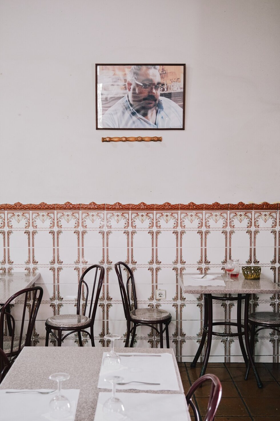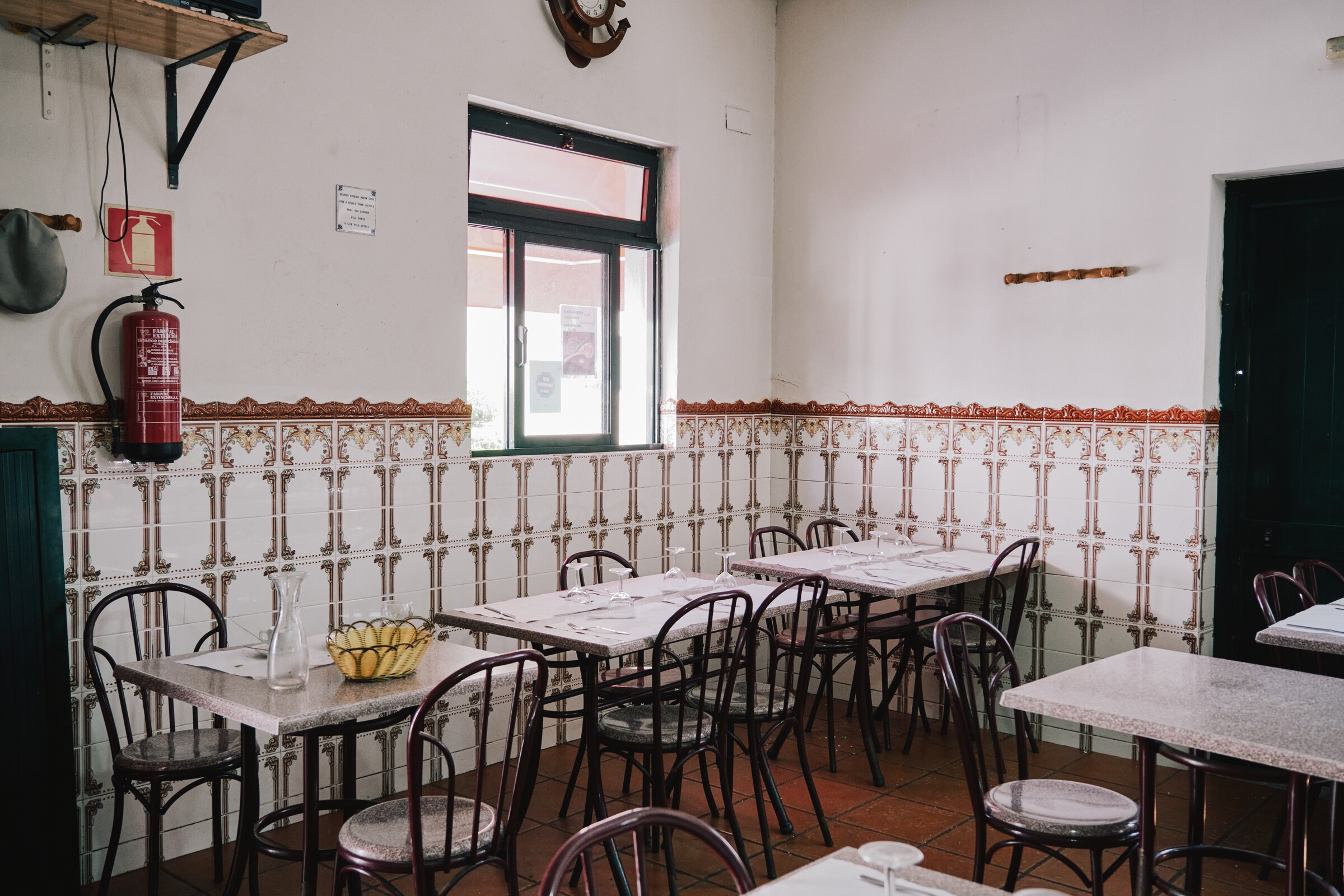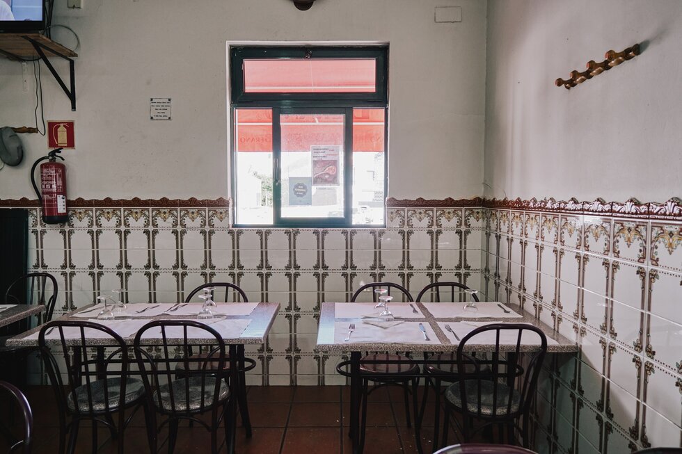 A Ramadinha localiza-se em Custóias e é um pequeno espaço com azulejos na parede, típicos de um estabelecimento de restauração português.