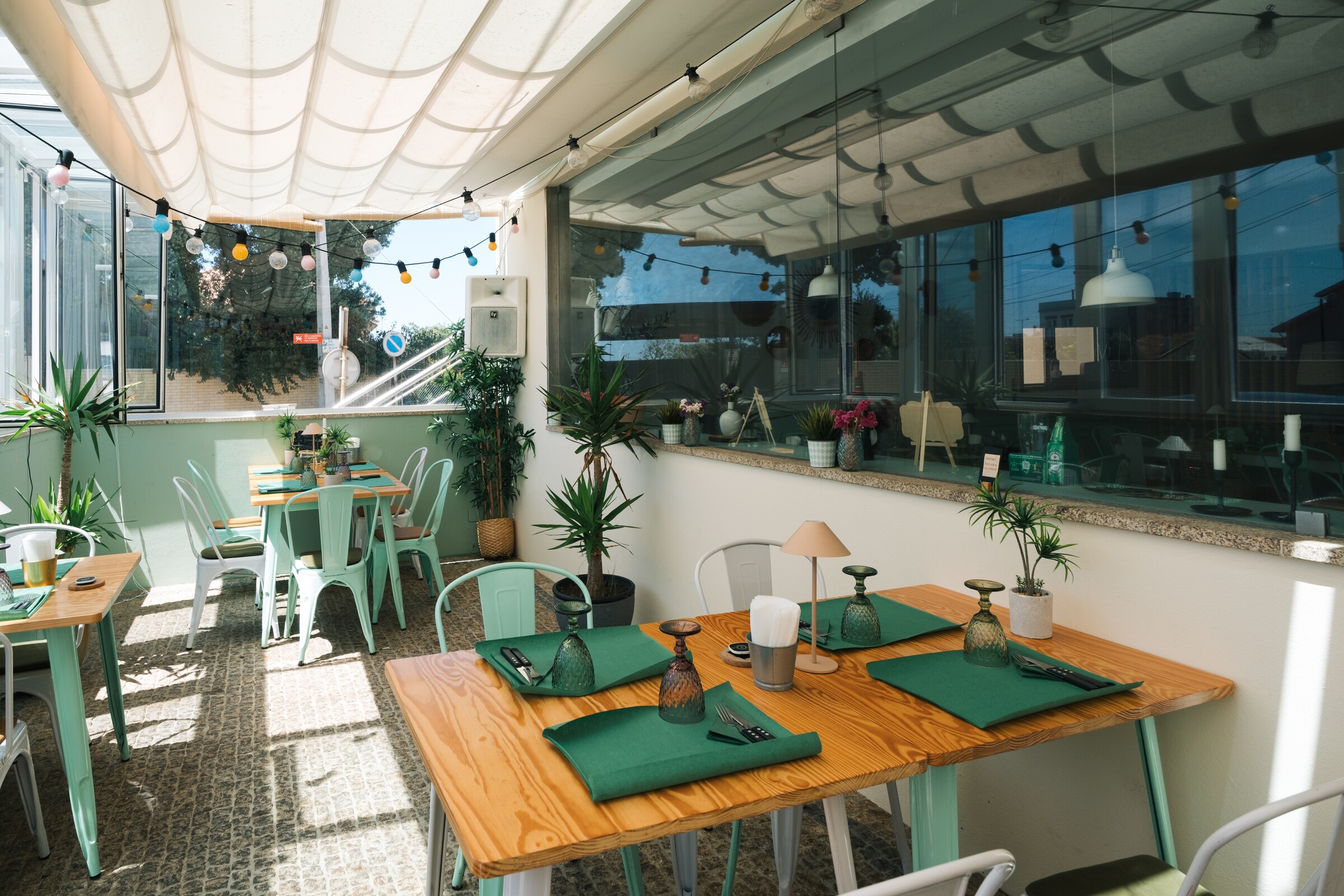 Na Dona Odete Hamburgueria cheira-se a verão todo o ano. O ambiente fresco e leve dos tons da sala, convida-nos a sentar descontraidamente.